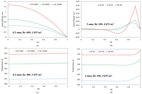 Axial velocity and temperature profiles at different axial locations (indicated by distances from the inlet (l) over diameter (d) ratios). The radial locations are specified as the distance from the tube center (r) over the tube diameter (R): (a) 0.2 mm diameter tube, axial velocity; (b) 2 mm diameter tube, axial velocity; (c) 0.2 mm diameter tube, temperature; (d) 2 mm diameter tube, temperature.