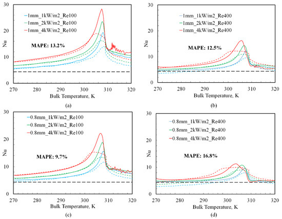 Equation (11) based predictions of Nu (dotted lines) versus bulk temperature (TBULK) at tube diameters of 1 mm and 0.8 mm and different inlet Re: (a) 1 mm, Re 100; (b) 1 mm, Re 400; (c) 0.8 mm, Re 100; (d) 0.8 mm, Re 400. CFD-based Nu calculations are shown in bold lines. The values of B in Equation (11) were: 0.37 for TBULK< TPC and 0.35 for TBULK> TPC.