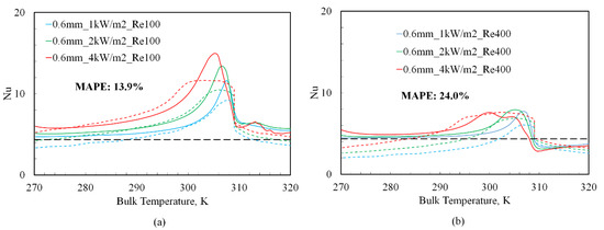 Equation (11) based predictions of Nu (dotted lines) versus bulk temperature (TBULK) at a tube diameter of 0.6 mm and different inlet Re: (a) 0.6 mm, Re 100; (b) 0.6 mm, Re 400. The values of B in Equation (10) w ere: 0.37 for TBULK < TPC and 0.30 for TBULK > TPC.