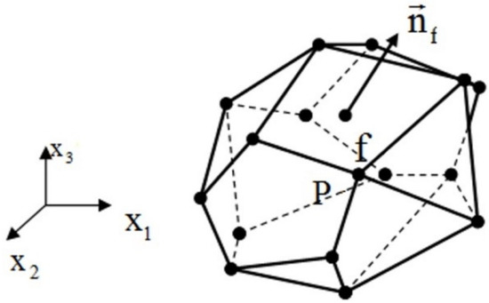 A finite volume method is based on integration of initial differential equations by the reference volume. Reference volumes (cells of the mesh) are arbitrary polyhedrons that cover the domain without gaps and overlaps. Each polyhedron is limited with a random number of facets. The vertices of the facets are the nodes of the mesh. A general view of the cell is given in Figure 1.