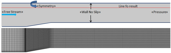 The operation of the limiter (at various values of parameter K) is considered using the example of the problem of supersonic flow around the wedge, where the parameters of the incident flow are as follows: Mach number is 2, the pressure is 101,325 Pa, and the temperature is 300 K [39]. Structured computational mesh is used for simulation with the number of cells at 95,000. General view of the computation domain and mesh are shown in Figure 4.