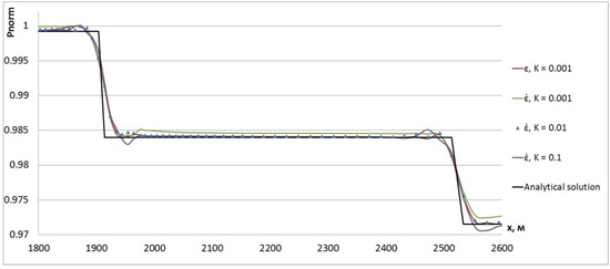 According to the plot, at K = 0.1 and K = 1 the produced result complies with the computation result without a limiter, i.e., at such values of K, the solution is fully unlimited (complete computed value of the gradient is taken at the reconstruction step). The solution produced at K = 0.01 is characterized with local maximums that have a non-physical (fictitious) origination character that can cause a considerable error in the solution, as it acquires extremely non-monotonic behaviour.