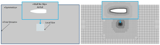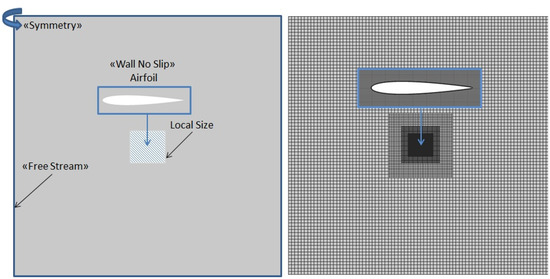 Let us consider this problem with the following boundary conditions. Parameters of the incident flow at the external boundary of the computational domain correspond to the values: the pressure is 46,066.2 Pa, the temperature is 248 K, the Mach number is 0.7, and the angle of attack is 1.489° and 3.046° [39,40,41]. The surface of the airfoil is considered to be a no-penetrated wall; a symmetric boundary condition is set at the sides.
