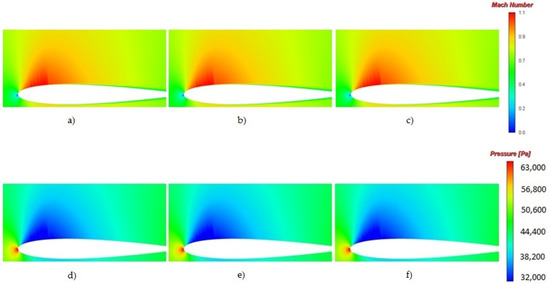 When increasing the angle of attack to 3.046°, a more intensive compression shock is formed above the airfoil. It has a more expressed front and creates a large area of decreased pressure. Mach number and pressure contours are presented in Figure 13.