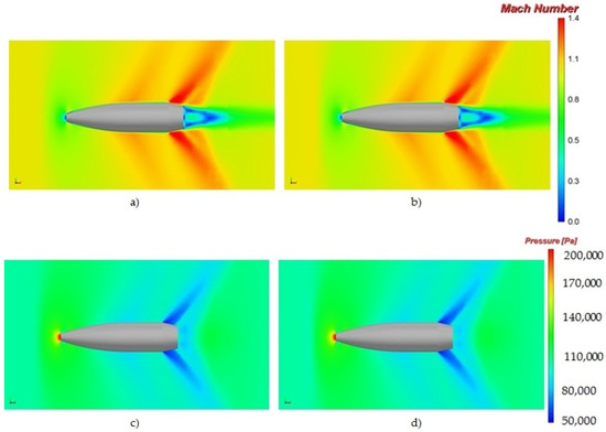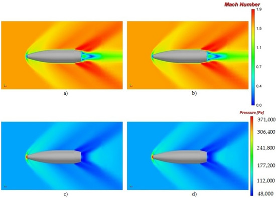The geometry of the bullet, the properties of the flow, and experimental aerodynamic parameters are taken from the work of Author [42]. Let us take the problem with the following boundary conditions. Parameters of the striking flow at the external boundary of the domain correspond to the following quantities: the pressure is 101,325 Pa, the temperature is 288.15 K, the angle of attack is 0°, and the Mach number is 1.05 and 1.6 [42]. The surface of the bullet is taken as a solid wall, and a symmetric boundary condition is set on the side boundary.