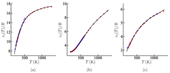 We first consider the specific heat at constant volume according to the data of that at constant pressure in [59,60]. We use the following fitting formula for :