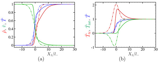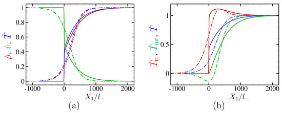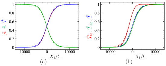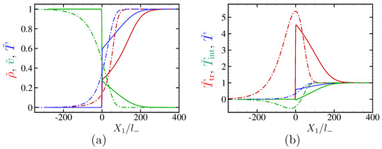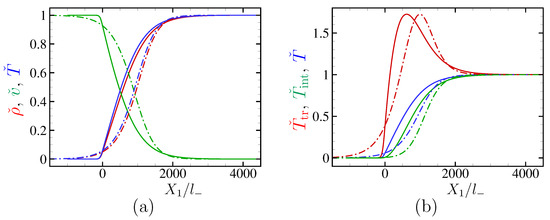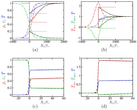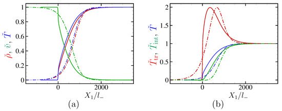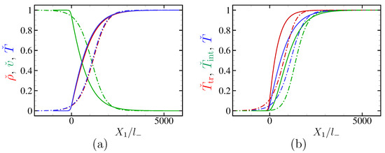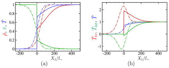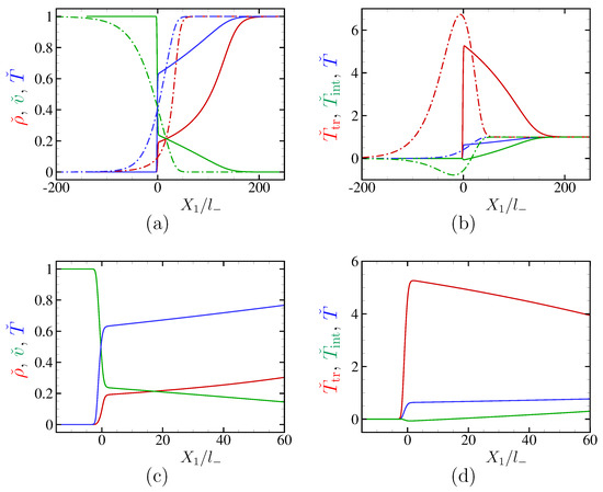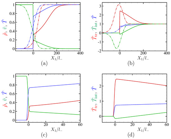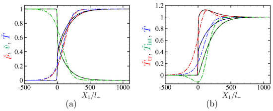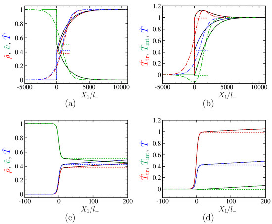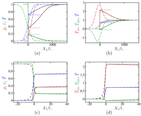 Figure 2, Figure 3 and Figure 4 show the profiles of , , , , and inside the shock wave at in the case of the pseudo-CO gas; Figure 2 is for , Figure 3 for , and Figure 4 for . Note that and at . In each of Figure 2, Figure 3 and Figure 4, panel (a) shows the profiles of , , and , and panel (b) those of , , and ; in Figure 4, panels (c) and (d) are, respectively, the magnified figures of panels (a) and (b). The solid line indicates the result based on the two-temperature NS equations (18), and the dot-dashed line that based on the ordinary NS equation (14). The respective macroscopic quantities are shown in different colors, which can be recognized from the colors of the labels on the vertical axis. To be more specific, the red, green, and blue lines indicate, respectively, , , and in panels (a) and (c) and , , and in panels (b) and (d). In Figure 3 and Figure 4, , , , , and obtained by using the ES model (2) [41] is also shown by the black dashed line, and in Figure 4c,d, the result based on the ordinary NS equations is not included. In addition, in Figure 4, the result for (or ), obtained by the two-temperature NS equations, is shown by dotted lines. It should be noted that the Rankine–Hugoniot relations are different from (23) when (see Appendix B.2 in [41]).