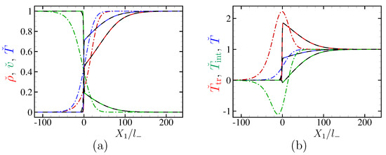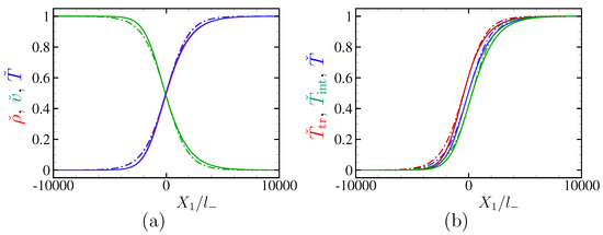 As in [41,58], we show the profiles of the density , the flow velocity (the component), and the temperatures T, , and normalized in the conventional way, i.e.,