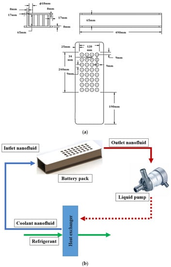 (a) The schematic of the battery pack. (b) The general schematic diagram of the battery pack cooling loop.