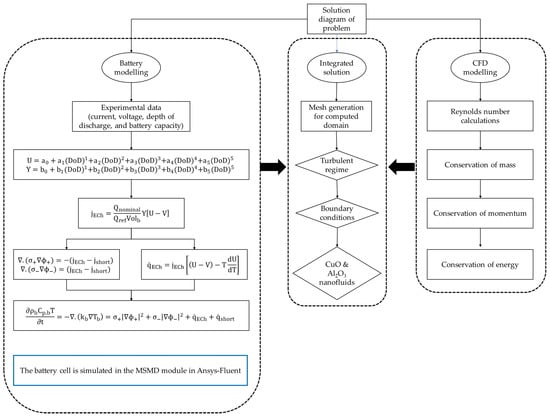 The battery’s thermal behavior in different operating conditions was assessed using numerical simulations. Accordingly, the battery cell was simulated in Ansys-Fluent 2020R2 by the Multi-Scale Multi-Domain (MSMD) module. Therefore, the battery heat flux at different C-rates for different depths of discharge was obtained. The Multi-Scale Multi-Domain (MSMD) approach is an appropriate solution at particle, electrode, and cell levels [51,52]. The Newman, Tiedemann, Gu, and Kim (NTGK) models were utilized to study the heat generation in batteries resulting from the number of discharges and the impact of discharge intensity on heat production. This model has been proposed in many articles due to its high accuracy in the thermal and electrochemical simulation of batteries. Figure 2 depicts the methodology of this study for developing our CFD simulation model. The battery parameters U and Y, presented in Equations (7) and (8), were obtained from the experimental results [53,54].