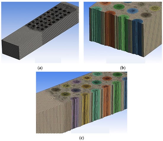 To ensure grid independence, a study was conducted wherein the wall function and independent assessment requirements for grid size were selected. Thereafter, structured grids were produced using ANSYS Meshing for both the battery and fluid domains, as illustrated in the following Figure 5.