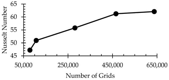 The maximum temperature of each column using air tends to be stable for a grid with a mesh count of 500,000. Based on the plot data, it is evident that the Nusselt number remains constant at 60.5 for the final two meshes. Hence, to enhance the computational performance and diminish the time taken for iterative calculations, the study employed a mesh count of 500,000.