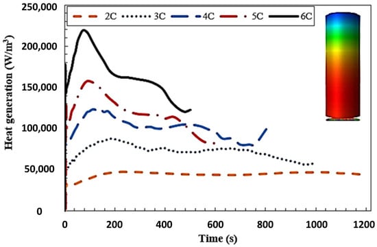 To assess the battery heat generation, a single cell is simulated at various C-rates. Figure 7 presents the results of the battery thermal simulation for a single battery cell without any cooling. As shown, at the discharge value of 2C 48,000 W/m3, heat was generated, which agreed with the experimental work conducted by Fan et al. [22]. Transient battery heat generation for higher C-rates (3C, 4C, 5C, and 6C) was obtained and is presented in this figure.