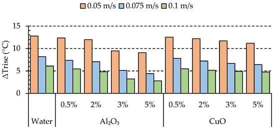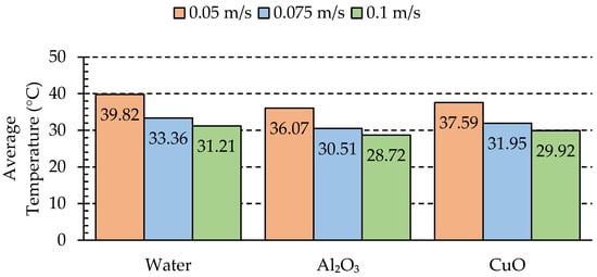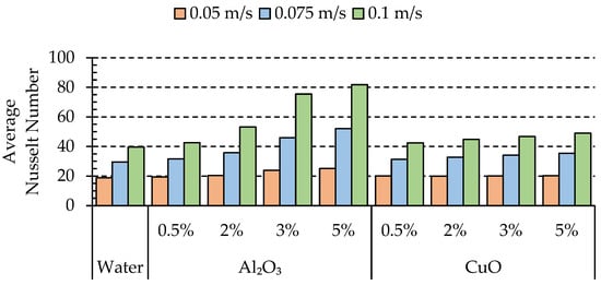 As indicated in Figure 8, by using Al2O3, decreases significantly by increasing the velocity from 0.05 m/s to 0.1 m/s. Table 6 demonstrates the influence of various volume concentrations (φ) of the nanofluids and inlet velocities on compared to water. According to data presented in this Table, Al2O3 nanofluid led to a substantial increment in the rate of heat transfer when compared to both CuO and water, primarily due to the superior thermal conductivity exhibited by Al2O3.