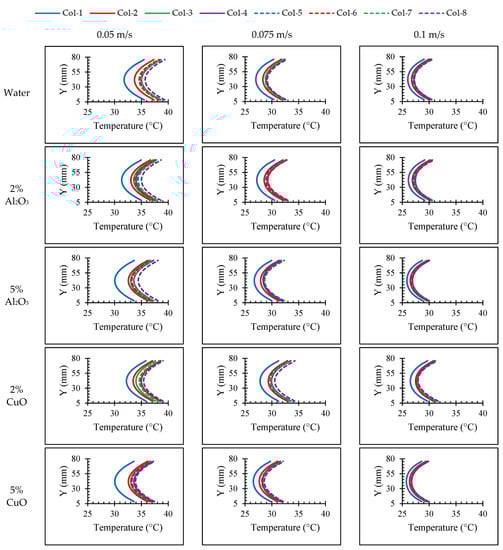 Figure 16 demonstrates the average of the temperature distribution along the batteries in different columns during the first 100 s for the high-performance operation at a 5C discharge rate (see Figure 15) and the influence of two selected nanofluids at different velocities in comparison with the base fluid. During the high-performance mode, the vehicle’s battery pack will be under stressed heat, during which the high-power requirements will cause elevated heat flux and temperature. As such, the thermal management system should ideally preserve the batteries’ temperature below 40 °C. According to this figure, 5% of the Al2O3 and the CuO nanofluid caused a temperature reduction of up to 7.89% and 4.73% compared to pure water. It is noteworthy that when it comes to cooling purposes, the differences in performance between the Al2O3 and CuO nanofluids may not be readily apparent. However, in terms of achieving uniform temperature reduction across battery cells in various columns, CuO exhibited excellent performance, as illustrated in Figure 16.