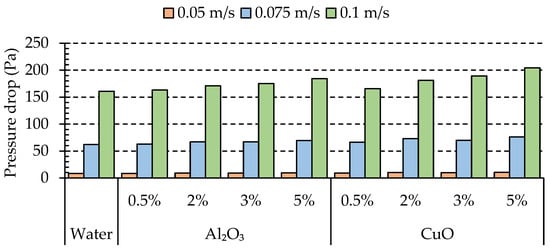 As shown in Figure 11, the nanofluid flow in the cooling system did not add much to the pressure drop, especially at low concentrations. However, there was a small increment in the pressure drop for higher concentrations of the nanoparticles at higher velocities. At 0.05 m/s, an extra-low velocity of the nanofluid, the pressure drop difference between different nanofluid volume concentrations of Al2O3 and CuO with the water was not noticeable, whereas the pressure drop started to differentiate with increasing velocities. At 0.075 m/s, for the 0.5% and 2% concentration of Al2O3, the pressure drop in the cooling systems was 62.82 Pa and 66.88 Pa, respectively, which is 1.26% and 7.81% greater than the pressure drops of pure water. In addition, for Al2O3 at concentrations of 3% and 5%, the pressure drop increased by 8.16% and 12.3%; nevertheless, at 0.1 m/s, the pressure drop was increased more compared to the other two velocities (0.05 and 0.075 m/s).