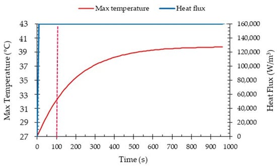 The heat flux and temperature changes during the high-performance mode of 100 kW of the selected vehicle battery pack’s energy storage at a 5C discharge rate.