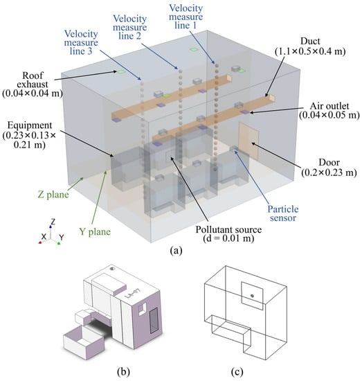 Figure 1a shows a schematic diagram of the scale laboratory bench with dimensions of length (X) 1.2 m, width (Y) 0.9 m, and height (Z) 0.8 m. The model contains the ventilation system, production equipment, and contamination sources. The ventilation system is a roof exhaust and ducted air supply system. In this case, the roof vent size is 0.04 m × 0.04 m, two ducts are installed at Z = 0.5 m, and there are three air outlets under each duct with a size of 0.04 m × 0.05 m. The machine equipment in the model is an LA-type CNC lathe shown in Figure 1b with dimensions of 0.23 m × 0.13 m × 0.21 m. The front is a transparent operating door, and the bottom pipe is used to discharge the waste chips and fluids generated during the machining process. Figure 1c shows a simplified model of this study, and a circle (d = 0.01 m) on the operation door is used to simulate the source of contamination.