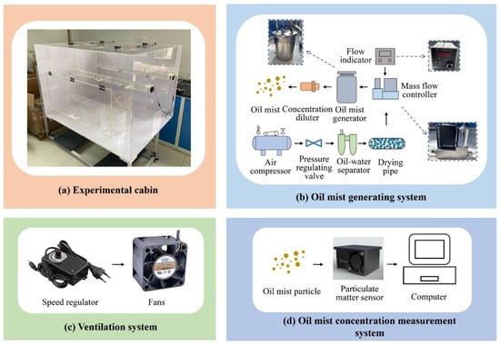 The experimental system is shown in Figure 2, which mainly includes (a) an experimental cabin, (b) an oil mist generating system, (c) a ventilation system, and (d) an oil mist concentration measurement system. In the oil mist generation system, the high-pressure air is generated by the air compressor. The compressed air is treated by the water–oil separator and drying tube and then enters the oil mist generator. The aerosol is released through a nozzle in the generator. To ensure a stable air flow, the compressed air is controlled by a mass flow controller (range: 0 to 50 L/min). A concentration diluter is connected to the outlet of the oil mist generator. By adjusting the value of the mass flow controller, the airflow into the aerosol generator can be controlled at a low flow rate to ensure a stable amount of oil mist emission. The ventilation system consists of a fan and a speed controller. The speed controller changes the fan speed to control the ventilation volume.