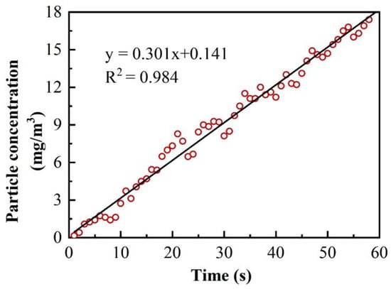 To measure the rate of oil mist emission, an experimental chamber was first closed, and a fan was used for mixing inside to ensure adequate mixing of the particles inside the chamber. Figure 4 shows the emission rate results from Equation (3) and the aerosol detector. The slope of the fitting curve was 0.3, the volume of the test bench was 0.028 m3, and the emission rate was calculated as 0.0085 mg/s. The lathe’s oil mist emission ranges from 0.007 mg/s to 0.114 mg/s.