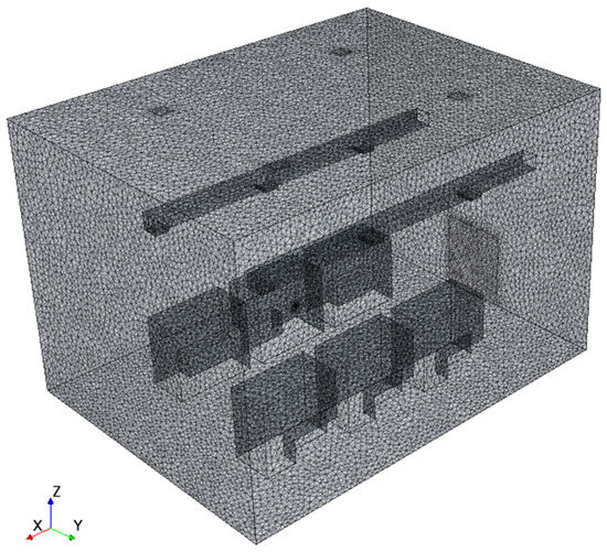In this study, a tetrahedral grid was used and fine mesh was used for the air inlet and outlet, as shown in Figure 6. The wall function was set as the standard wall function, so the y* was greater than 11.225 [46,47]. The model was divided into different grid numbers, namely, 0.36 million, 0.69 million, 1.43 million, and 2.80 million. The details of the calculations are shown in Section 4. This investigation used the finite volume method to discretize the governing equations and the semi-implicit method for pressure linked equations (SIMPLE) algorithm to couple the pressure and velocity. The pressure staggering option (PRESTO!) scheme was adopted for pressure discretization, and the second-order upwind discretization scheme was used for iterations for all variables except pressure to achieve higher accuracy. Convergence was reached when the residuals were less than 10−6 or air velocity and oil mist concentration varied within a limited range at some monitoring sites. In the Lagrangian model, the quantity concentration of particles below 2.5 μm in the machining workshop is maintained at 400~800 P/cm3 and accounts for more than 98% [2]. Converted to volume fractions, it is approximately 1.4 × 10−8~2.7 × 10−8. Since indoor particulate matter usually occupies a very low volume fraction, the effect of airflow on the distribution of oil mist is usually studied, rather than the other way around [48]. Thus, the effect of discrete relatively continuous phases is not considered in this paper, i.e., a single-phase coupling approach is adopted.