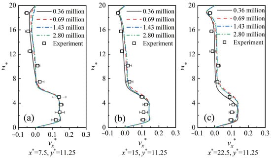 Figure 7. Comparison of numerical and experimental results under the roof exhaust condition. (ac) are the comparisons of experimental and CFD results at lines 1, 2 and 3 with different grid numbers.