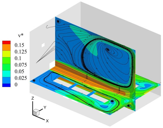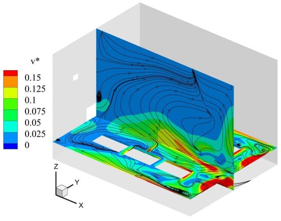 Referring to the results in the previous section, this section uses the same grid strategy for the calculation of the flow field under mixed ventilation conditions. Figure 9 shows the comparison of experimental and measured results in mixed ventilation conditions. Figure 10 shows the distribution of the flow field in mixed ventilation conditions. From Figure 9, it can be seen that the numerical results are more consistent with the experimental results at lower altitudes. When the altitude increases, the difference between the experimental and numerical results is greater due to the smaller airflow velocity. In general, the experimental and numerical results are in agreement. Figure 10 shows that due to the influence of the ducted air supply system, there are fewer vortices in the room compared to when only the roof exhaust is available. While there is more airflow directed to the roof vents, the higher airflow velocity is more concentrated in the lower part of the factory, which may lead to excessive concentrations of pollutants in certain parts.