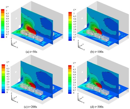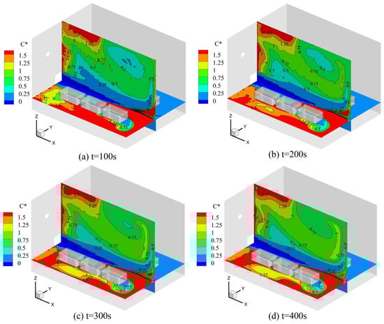 Figure 11. Oil mist concentration distribution at different times under roof exhaust conditions.