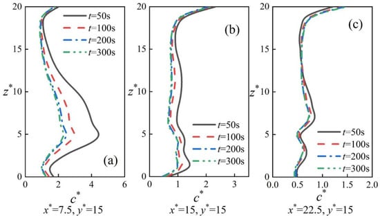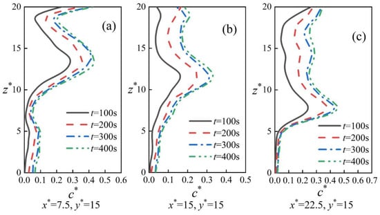 Many factors affect the calculation results of the Lagrangian method, among which the most obvious influence is the calculation time. Therefore, this section first investigates the concentration distributions at different calculation times. Figure 11 shows the concentration distribution at different calculation times. It can be found that when the calculation time is short, such as t = 100 s, the spatial concentration distribution is not continuous, and as time increases, the concentration distribution gradually becomes continuous. Moreover, the change in particle concentration distribution from t = 300 s to t = 400 s is not obvious.