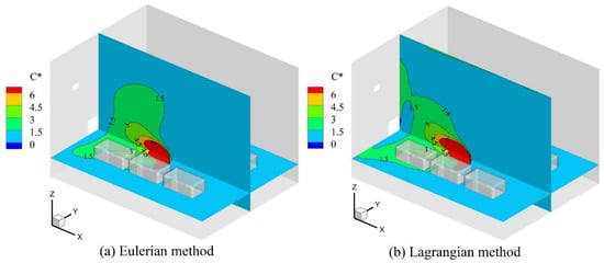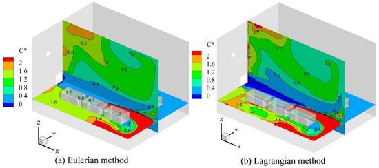 In this section, indoor pollutant transport under roof exhaust conditions is investigated, and the results of the Eulerian and Lagrangian methods are compared.