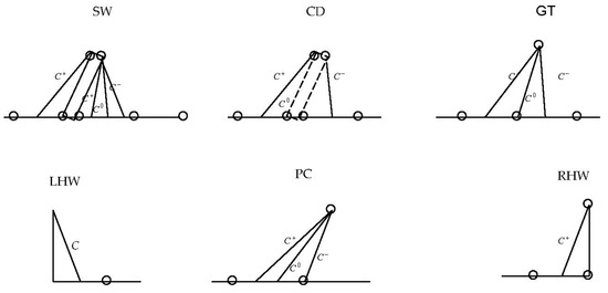 To solve the system of Equations (1) and (2), supplemented by Relations (3)–(11), the grid-characteristic method is used with an explicit isolation of all discontinuities formed in the flow field [6,7]. The applied grid lines (design points) can belong to one of the following types: gas trajectory (GT); fixed point (FP); shock wave (SW); contact discontinuity (CD); characteristic of the C+ family (PC+); characteristic of the C− family (PC−); discontinuous characteristics (DC+, DC−); rigid wall (RW); or left (LH) and right (RH) boundaries of the computational domain.