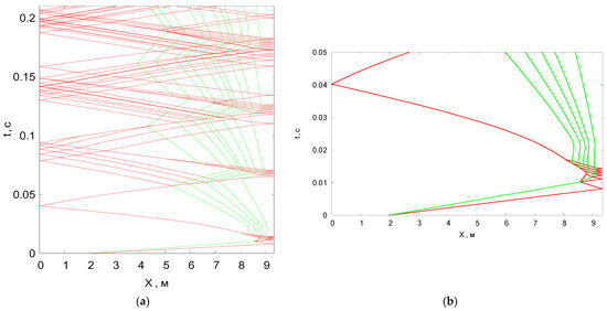 As a result of numerical simulation, the flow structure presented in Figure 1 was obtained. Here, the red lines indicate the trajectories of shock waves, and the green lines indicate contact discontinuities. During the observation time, which was ~0.2 s, the initial shock wave managed to be reflected four times from the ends of the installation (Figure 3a). Figure 3b shows an enlarged fragment of a complex shock wave structure that appears when the incident shock wave is first reflected from the wall and interacts with the initial contact discontinuity. The flow structure includes a set of secondary shock waves and contact discontinuities of varying intensity. It should be noted that, in contrast to the shock-capturing method, all generated shock waves and contact discontinuities are clearly distinguished; they are double computational grid nodes, which are interconnected by the exact fulfillment of the Rankine–Hugoniot relations. When these computational nodes interact with each other, the Riemann problem is solved with high accuracy. The shock waves and contact discontinuities formed as a result of the solution become new grid nodes.