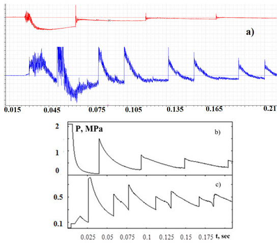 Figure 4 provides a comparison of pressure sensor readings typical for this series of experiments with the results of the numerical modeling. Figure 4a demonstrates the readings of the pressure sensors located at the HPC end (the upper curve) and in the middle of the LPC (the lower curve). Figure 4b,c demonstrate the results of numerical modeling of the flow in the installation: the graph of the pressure at the LHW, which corresponds to the readings of the HPC end sensor, and the graph of the pressure in the middle of the LPC. The modeling technique under consideration makes it possible to “take” the readings of the sensors. To perform this, fixed nodes with coordinates corresponding to the location of the pressure sensors along the setup length are introduced into the computational grid.