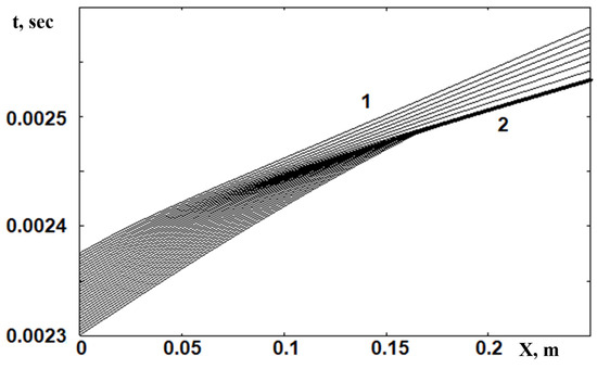 The Mach number of the incident SW varied. Figure 5 shows a typical time sweep of the process. In contrast to the results presented in [20], the case was considered when the incident wave propagates with a Mach number equal to Mi = 3 through a combustible mixture having a temperature T0 = 298.15 and P0 = 1.01325 × 104 Πa. Figure 6 shows a detailed picture of the flow during the formation of a hanging shock (HSW, Figure 5 line 2), which is a consequence of the intersection of the C+ family sound characteristics, the trajectories of which are grid lines.