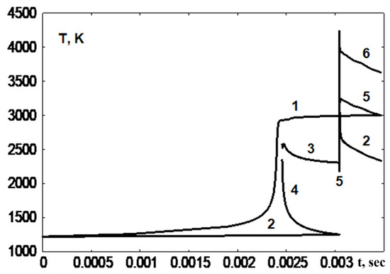 The temperature behind the reflected SW exceeds the self-ignition temperature of the combustible mixture, and ignition occurs at the left wall (Figure 7, curve 1). An increase in temperature and pressure leads to the appearance of a compression wave, which, at t ~ 0.00245, forms a “hanging” shock wave (Figure 5 and Figure 6). It should be noted that the temperature drop at the hanging SW at the moment of its origination depends on the computational grid; in the calculation, it is less than 100 K (Figure 7, curves 2, 3). At subsequent time stamps, the hanging SW intensity increases, and a detonation wave is formed (Figure 7), which propagates behind the reflected shock wave. At t ~ 0.0031, the waves interact; an overcompressed detonation wave, a contact discontinuity, and a fan of expansion waves are generated (Figure 5). Over time, the intensity of the detonation wave decreases, and it enters the propagation regime with parameter fluctuations around a certain stationary state.