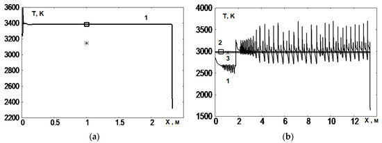 Temperature distribution (1) behind the reflected SW: (a)—Mi = 4, t = 0.00287 s; (b)—Mi = 3, t = 0.0152 s; , (2)—temperature behind the equilibrium reflected wave; *, (3)—temperature behind the Chapman–Jouguet wave.