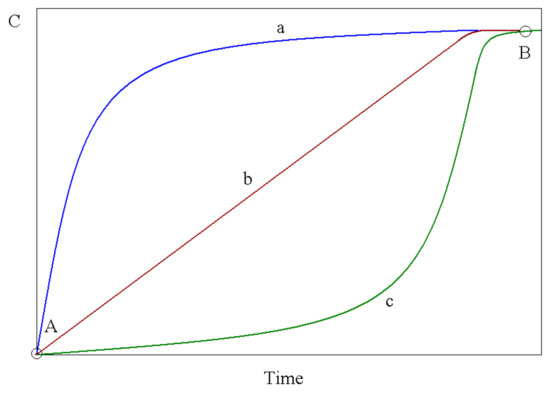 Mixing in chemical processes is often evaluated as a function of the quality in the homogeneity of one phase distribution in another. The mixing in of liquids is very important for improving industrial practices. Therefore, the diffusion of liquids is critical to evaluate the mixing efficiency. Hydrodynamics studies based on an analysis of concentration and residence time distribution curves (RTDCs) have been used by many authors to understand the mixing evolution [4,5,6,7,8,12,13,14,15,16,17,39,40,41,42,43]. Figure 1 shows three typical curves of an analysis of mixing as a function of time. Here, points (A) and (B) are the initial and final steady states. Curve (a) shows a very quick diffusion at the beginning. As a consequence, the efficiency of the mixing is high [15,16,17,18,24,25,30,39,40,41,42,43]. Nevertheless, this efficiency decreases over time. The second curve (b) shows a constant evolution of the mixing; this kind of curve is very difficult to find in real chemical processes because it is a constant evolutive ideal case; this means that the evolution of the chemical reaction will always be at the same velocity [16,19,26,27,28,29,30,41,43]. The third curve (c) shows a slow mixing evolution at the beginning, but the efficiency increased over time. During real practice, often these three behaviors are present during the mixing evolution inside chemical reactors. A knowledge of the hydrodynamics in chemical reactors where liquids are being mixed is very important in order to modify the stirring conditions and improve industrial practices.