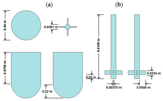 The impeller was a cylindrical shaft that was 0.610 m in length, with 4 blades in the lowest position that were 0.0508 m × 0.0254 m and 0.00375 thick. A finer 2D triangular mesh with 16,890 cells for discretizing the shaft and 657 cells for every blade was used. The impeller speed was 32 RPMs, and the moving rotating frame (MRF) condition was established in concordance. The computational model used for solving the domain was k-ε in the software ANSYS-Fluent (17.1).