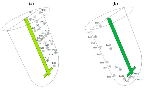 A control plane was defined vertically for reference. Then, this plane was divided into two subplanes, as shown in Figure 3a,b. Here, each of the injection points was placed, and the tracer was replaced the original resident fluid, while in the second semi-plane, the monitoring points were placed. These are the points where the tracer’s concentration was measured. Both planes were placed at 180° to each other, dividing the reactor into 2 sections. There were 22 injection points distributed in the tank to evaluate the influence of the injected place on the mixing time; then, every injected point was evaluated independently. The impeller speed was the same for every simulation, and the influence of the walls on the mixing was considered at the points where the fluid impacted and changed the path. Although, there were no injection points below the impeller, because during real mixing operations the tracer was injected using a tubing inlet system submerged in the bath making this geometrical disposition complicated; nevertheless, there were some monitoring points in the reactor bottom because this zone is critical for mixing as a consequence of frequent problems with tracer diffusion in this region [1,2,3,4,5,6,20,21,22,23,24,25,26,27,30,31].