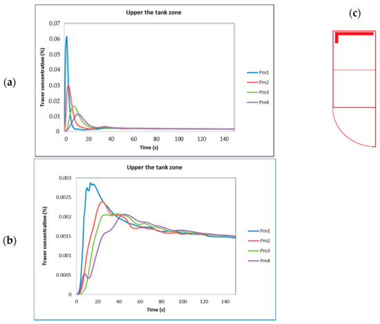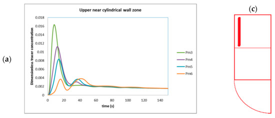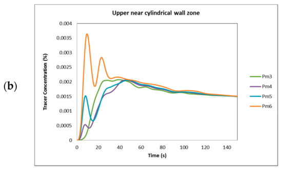 In Figure 6a, all points (pm5 to pm8) exhibited an oscillating, smoothed behavior, but the curves tended to delay achieving the final tracer concentration. The points (Pm5, Pm6 and Pm8) displayed a similar behavior because they were near the wall in the cylindrical zone, but pm7 was placed in the middle of the tank’s body. Furthermore, the oscillations were reduced in of all these curves as the simulation time increased; all of these curves showed an excess of tracer concentration, but the values were minor, as these points were far from the injection point (pi1), and the final tracer concentration was reached after 140 s.
