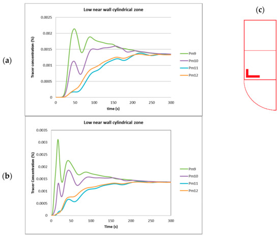 One analyzed injection point (pi1) was placed near the impeller shaft at a very high position near the tank’s top surface, and one point (pi9) was placed in the middle of the tank, as shown in Figure 3a. Figure 5, Figure 6, Figure 7, Figure 8, Figure 9, Figure 10 and Figure 11 show the tracer’s concentration in different zones inside the tank, where some curves are intentionally repeated in order to compare and then explain the hydrodynamics behavior of the liquid lead inside every zone of the tank compared with other points at vertical and lateral positions. All curves shown in these figures tended to an ideal value of the concentration Ctracer = 0.00135, which was the final tracer concentration value for considering total mixing, and the horizontal axes scales represent the required mixing time in s to obtain the final tracer concentration. Measurements of the tracer’s concentration in the tank during the simulation with the condition Ctracer > 0.00135 indicate an excess of the tracer in the region, in contrast to the condition Ctracer < 0.00135, which indicates a deficit of the tracer. Figure 5a, Figure 6a, Figure 7a, Figure 8a, Figure 9a, Figure 10a and Figure 11a correspond to the injection at point Pi1, and Figure 5b, Figure 6b, Figure 7b, Figure 8b, Figure 9b, Figure 10b and Figure 11b are for point Pi9. Figure 5c, Figure 6c, Figure 7c, Figure 8c, Figure 9c, Figure 10c and Figure 11c illustrate the analyzed zone inside the tank. Moreover, the time scales were estimated to illustrate when the final tracer concentration was reached.