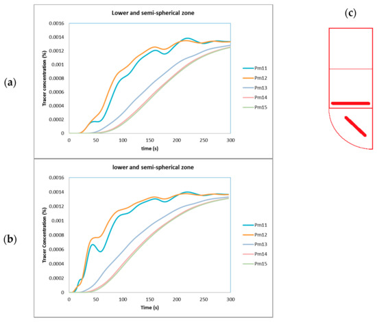 The evolution of the tracer’s concentration near the cylindrical lower wall section is shown in Figure 10a,b. In Figure 10a, all curves exhibit am oscillating damped behavior; here, the monitoring points Pm8 to Pm10 display an excess of tracer concentration, but the point Pm11 show a deficit, as it is placed between the cylindrical and hemispherical zones. The excess of the tracer concentration at points Pm8 and Pm9, as shown in Figure 10a, are minor in comparison with those for the injection point Pi9 due to the injection point being far away. Finally, all curves tended to the final tracer concentration, but the delay was longer than the curves for the point Pi9. In comparison, in Figure 10b, the monitoring point Pm8 was the nearest to the injection point; thus, it had the greatest tracer concentration. Moreover, the tracer concentration was reduced from Pm8 to Pm11 as a function of the distance from the injection point. The oscillating, alternating behavior can also be observed for all of the curves. Finally, only Pm11 was, again, the only point with no tracer excess.