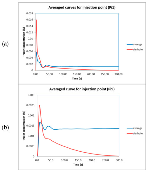 The contributions of all of the monitoring points can be added and averaged in order to obtain one single curve for representing the hydrodynamics behavior inside the tank and evaluating the mixing efficiency as a function of the injection points. Furthermore, the resulting curves can be derived and then the final tracer concentration can be subtracted to determine if the variation of the tracer concentration tended to zero (minimum variation); this means that the tracer was homogeneously distributed. In Figure 12a,b, the curves for the analyzed injection points are shown. Here, it is possible to confirm that the injection point Pi9 was the best because the values of the tracer concentration were always minor compared to those for the point Pi1. Moreover, on the vertical axis, the derivate curve values were also minor. The average curves tended to the final tracer concentration and the derived curves tended to zero. The tendency of all curves was 0.00135, which was the volume fraction of the tracer distributed in every 3D cell where the monitoring points were placed. As a criterion for the homogeneous distribution of the tracer, it was considered that the rest of the cells used for discretization of the volume in the tank must contain the same tracer concentration. Moreover, the invariability was considered as a criterion to determine that the extra time of stirring was not necessary.