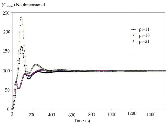 The values of the tracer’s concentration for the physical model and computational simulation were compared for validation of the Pi18, Pi11 and Pi21. These are shown in Figure 14a–c and compared to evaluate the fidelity between both models. In this figure, the difference is evident at the beginning of the simulation but reduces as the simulation continues over time; both curves tended to the final tracer concentration. Then, it is possible to mention that the global behavior was similar. Although there were some differences between the physical and computational modeling which could have affected the resulting curves.