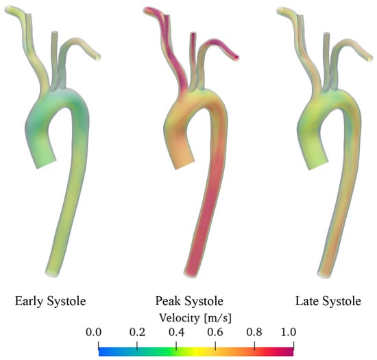 The distribution of wall shear stress (WSS) on the artery walls is an important parameter that can be used to investigate risks related to the aneurysms of the aortic arch [,]. Abnormal low and high WSS patterns can have significant implications for the development of vascular diseases on the artery walls. The advantage of CFD simulations in studying aortic flow is that they can help identify regions with abnormal WSS levels, which may be more prone to dilatation or aneurysm formation.