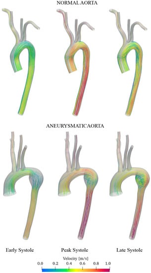 Unfortunately, flow measurements regarding the specific aorta here numerically investigated are not available, but the magnitude of the velocities predicted by CFD simulations are physiologically reasonable, being totally comparable with the ones measured with 4D magnetic resonance imaging (4D-MRI) in various literature works [,].