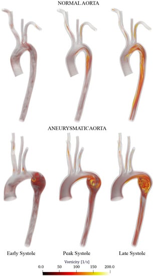 Observing the descending aorta, it can be noted how the flow is well organised and almost laminar, while the aneurysm enlargement creates chaotic vortical structures. The flow becomes unorganised, and the recirculation causes the blood particles to remain in prolonged contact with the aneurysm lumen surface, which can lead to the deposition of platelets on the surface []. The deposition of platelets on the lumen surface contributes to thrombus formation.