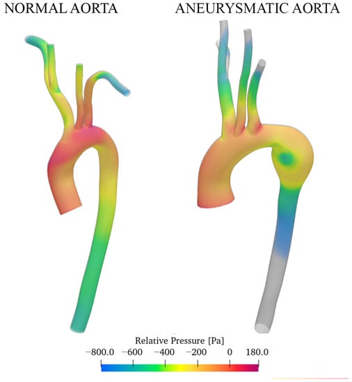 The maximum pressure is located at the aortic arch. Then, in the descending region of the aorta, the values decrease. The overall pressure variation is greater for the aneurysmatic aorta as a consequence of the structure of the flow field []. The aneurysm cavity presents a low-pressure region. A pressure minimum can be observed at the centre of the vortex as a consequence of the turbulent energy here dissipated.