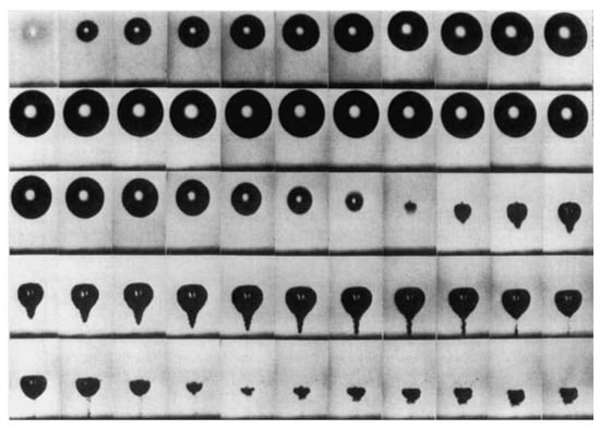 Formation of microjets in a single cavitation bubble generated via a laser pulse in distilled water near a solid object (recorded at a rate of 75,000 frames per second; frame size = 7.2 mm × 4.6 mm). Adapted from [55].