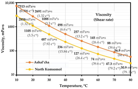 The objects of the given study were the crude oil samples produced from Ashal’cha (Republic of Tatarstan, Russia) and North Komsomol (Yamalo-Nenetsk Autonomous Region, Russia). The temperature-dependent viscosity curves for the crude oil samples are presented in Figure 3.